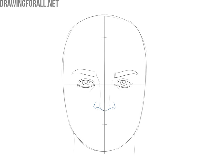 In this step, using light lines, we outline the basic contours of the nose. Don’t forget to draw a couple of pupils. The location and size of the pupils affect the direction and emotional color of the gaze.
