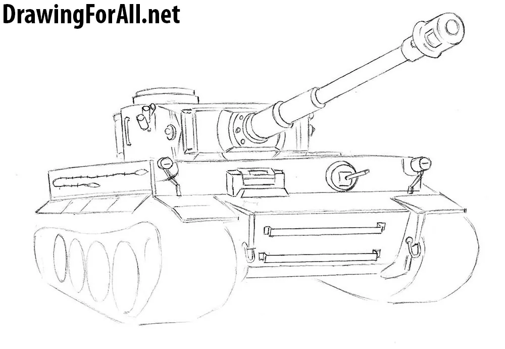 What next? Add some details to the Tiger Tank. Draw the trunk with a very impressive barrel, outline the main shapes of the body of tank. Sketch out the main outlines of the tracks as in the drawing below: