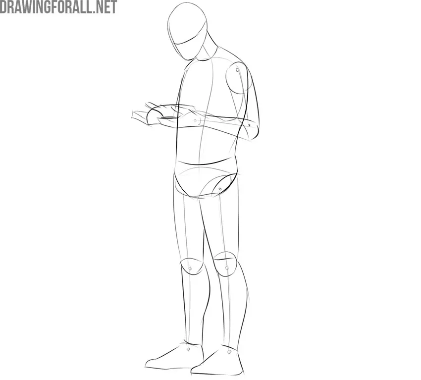 We have a character with a rather unusual pose. Let’s outline a stickman who will help emphasize the characteristics of the pose, as well as the basic proportions and position of the character on a piece of paper. By the way, we created a cool guide on human proportions. Be sure to read this guide before drawing a stickman.